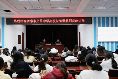 本网讯 4月2日下午,我校特邀湖北省特级教师、孝感市文昌中学副校长邹磊老师,在科技楼五楼报告厅开展“深耕班级建设 提升育人质效——班级管理的智慧与艺术”的专题讲座。本次讲座由教务处主办、人文传播系承办,人文传播系主任仰姝主持,相关专业教师、班主任及汉语言文学专业学生到场聆听学习。