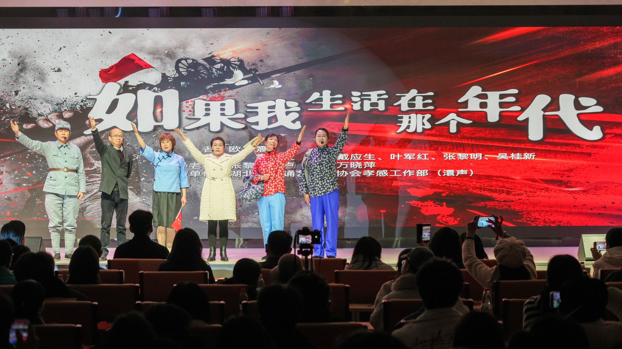 比赛现场,各参赛队伍紧扣主题创新表达,以“情景表演+多媒体+朗诵”的融合形式,将历史故事与青春担当生动呈现。人文传播系《青春的延安》等节目串联文化传承与红色信仰,文法系《破晓之音》再现觉醒年代青年呐喊,人工智能系《青春跟党走》诠释科技报国志向,各系作品均结合专业特色,展现新时代青年的责任与使命。此外,湖北省朗诵艺术家协会孝感工作部还带来表演《我生活的那个年代》,用岁月故事为比赛增添了别样厚度。