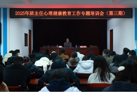 本网讯(学生记者 瞿长娥 见习学生记者 许建锋)11月19日,华中科技大学心理健康教育中心副主任雷光辉应邀作2025年第三期班主任心理健康教育工作专题培训,培训会由我校党委副书记蒋成主持,全体班主任参加培训。
