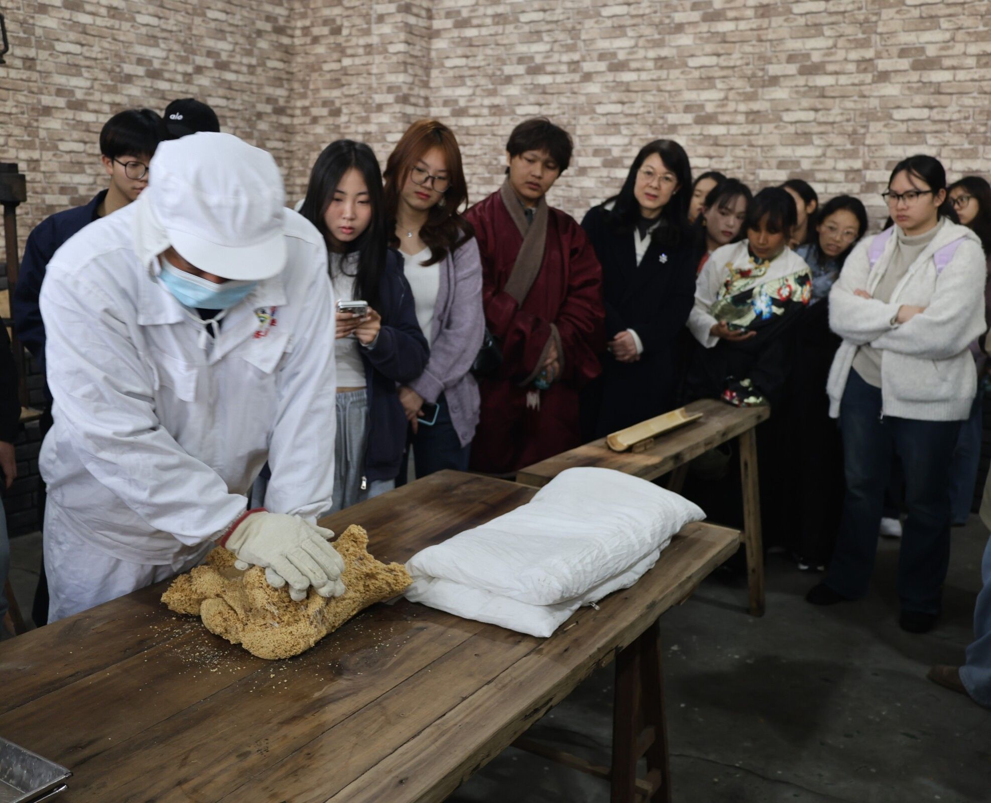 手工制作环节中,同学们跃跃欲试、积极参与麻糖制作实践。在非遗传承人的悉心指导下,大家依次体验炒、揉、捏、压、切等传统工序,切身感受传统手工技艺蕴含的匠心与独特乐趣。随后,师生一行走进现代化生产车间,近距离观摩麻糖米酒标准化生产流程,直观感受传统非遗技艺与现代工业生产的有机融合,进一步加深了对非遗文化的理解与认同。